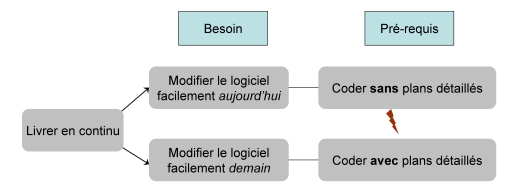 – Chaque relation de droite à gauche décrit une condition nécessaire, fondée sur une hypothèse, un modèle mental. Pour livrer en continu, il est nécessaire de modifier le logiciel maintenant comme demain (les besoins). Pour Jean-Pierre, livrer vite nécessite donc de coder au plus tôt, sans plans détaillés chronophages (le pré-requis).