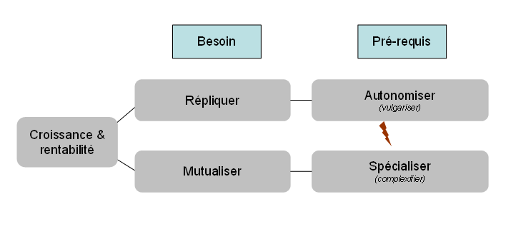 – Pour croître de manière rentable, il semble qu’il faille à la fois répliquer et mutualiser des moyens. Autonomiser est un pré-requis à la réplication de centres profits, et spécialiser est un pré-requis à la mutualisation de moyens.