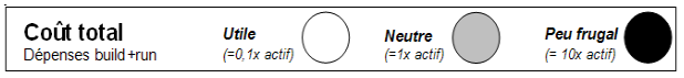 Now to remain visual and comprehensive, we’ll use a shade of gray to display costs as a fraction of value. The darker the shade, the lower the ratio TCO/value : dark assets cost more than what they are useful, light assets bring more value than what they cost. In the middle, grey assets are neutral, we could decide to «decomputerize», it would be the same for the company.